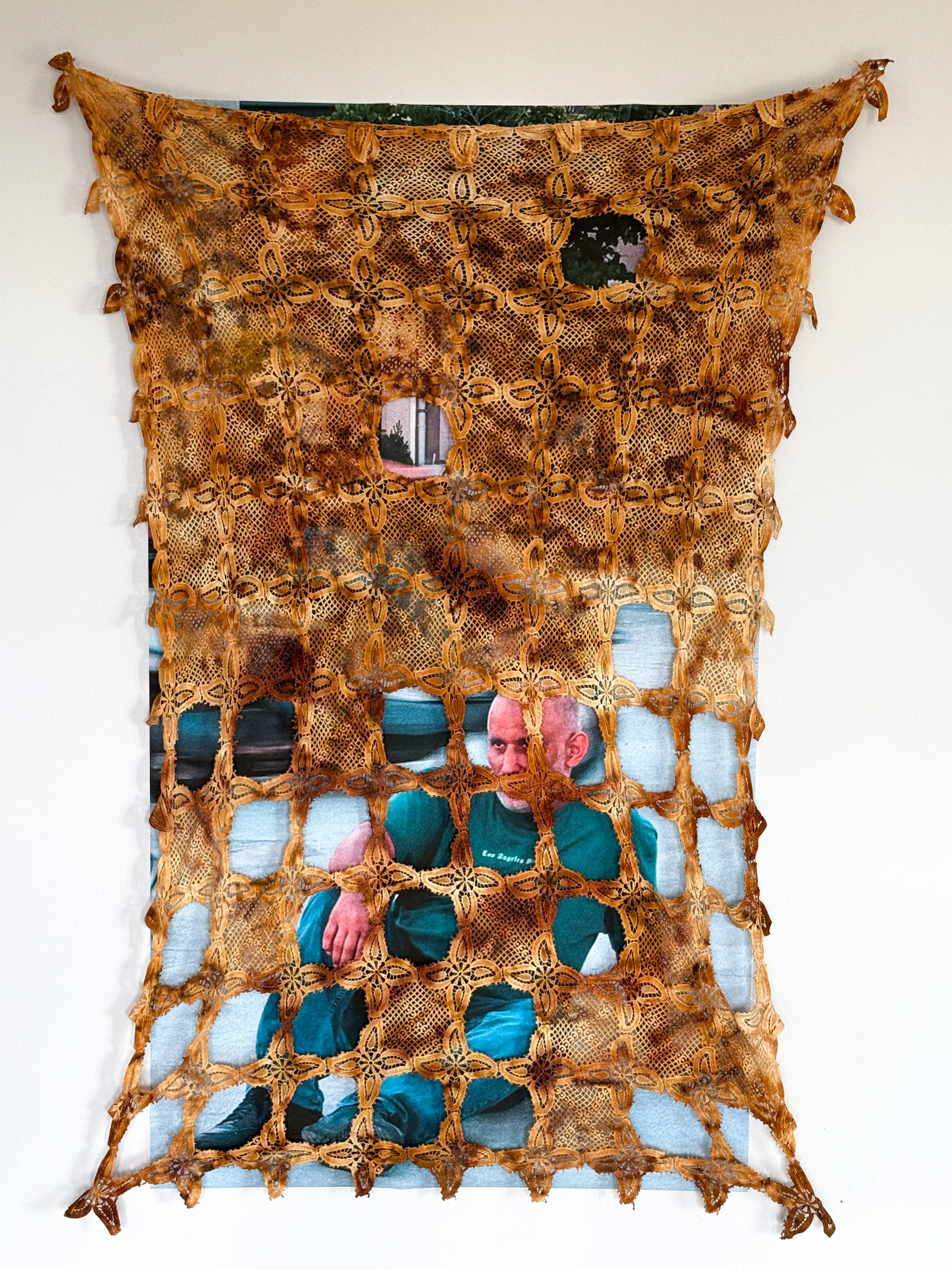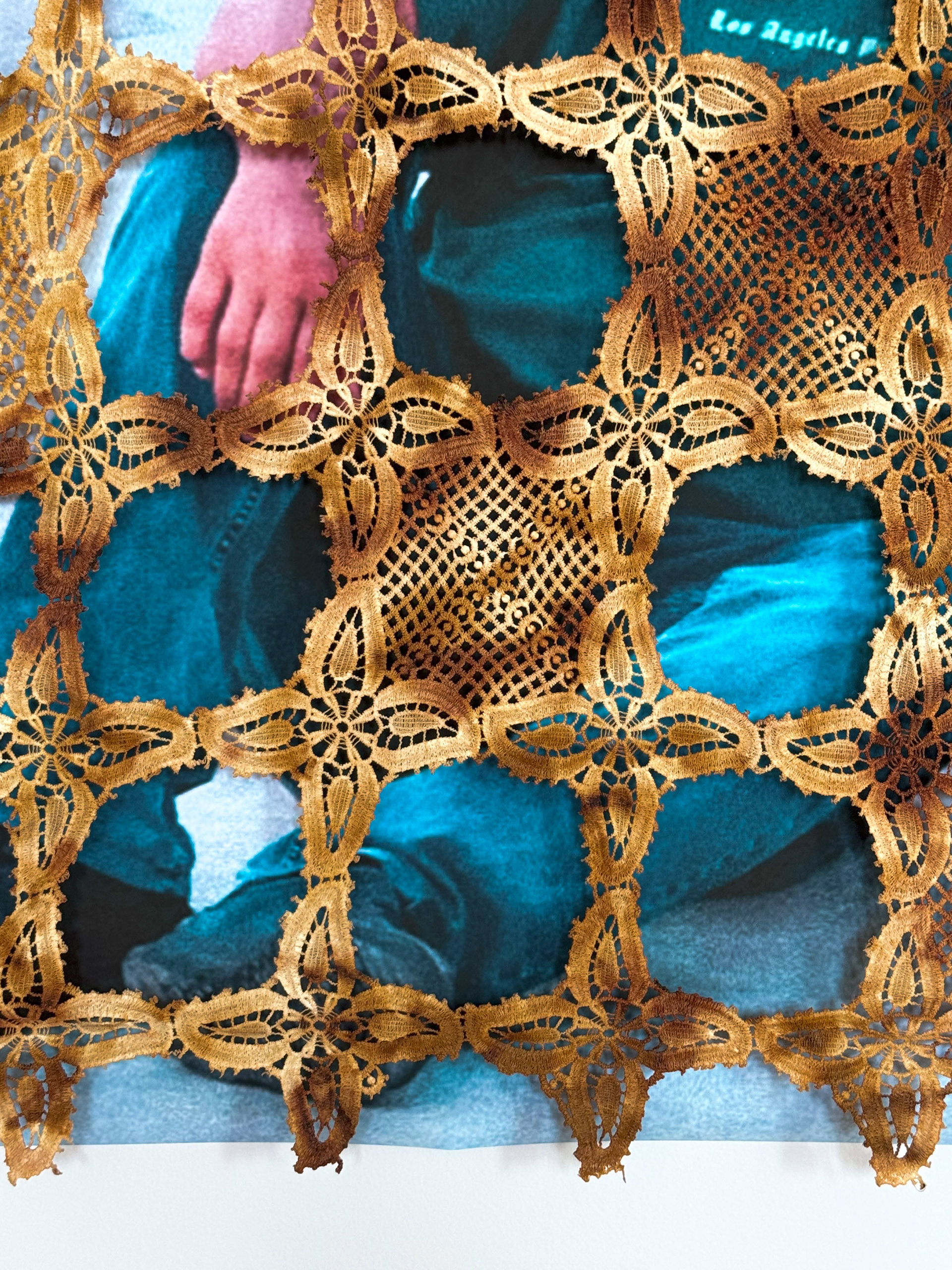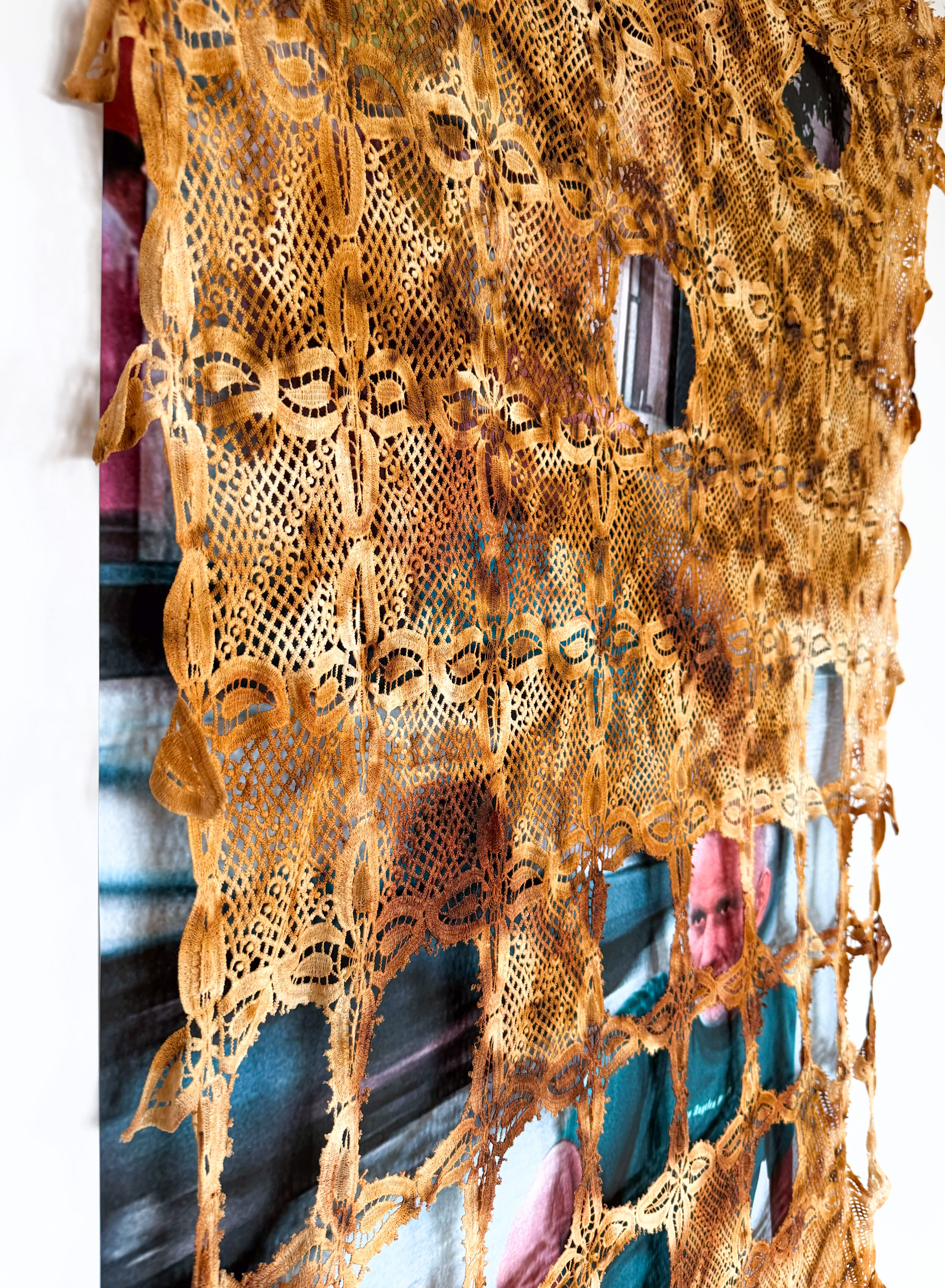 The lace tablecloth is removed from its familiar domestic context and transformed into a new narrative device. Displayed stretched on the wall, the surface is altered through deliberate interventions: cut, layered, and pressed, it shifts between curtain, filter, and screen. The photographs that appear behind the lace reposition the viewer from observer to observed, establishing a reciprocal gaze. This dual perspective turns the act of looking into a form of exposure, where the subject and the viewer become mutually implicated.